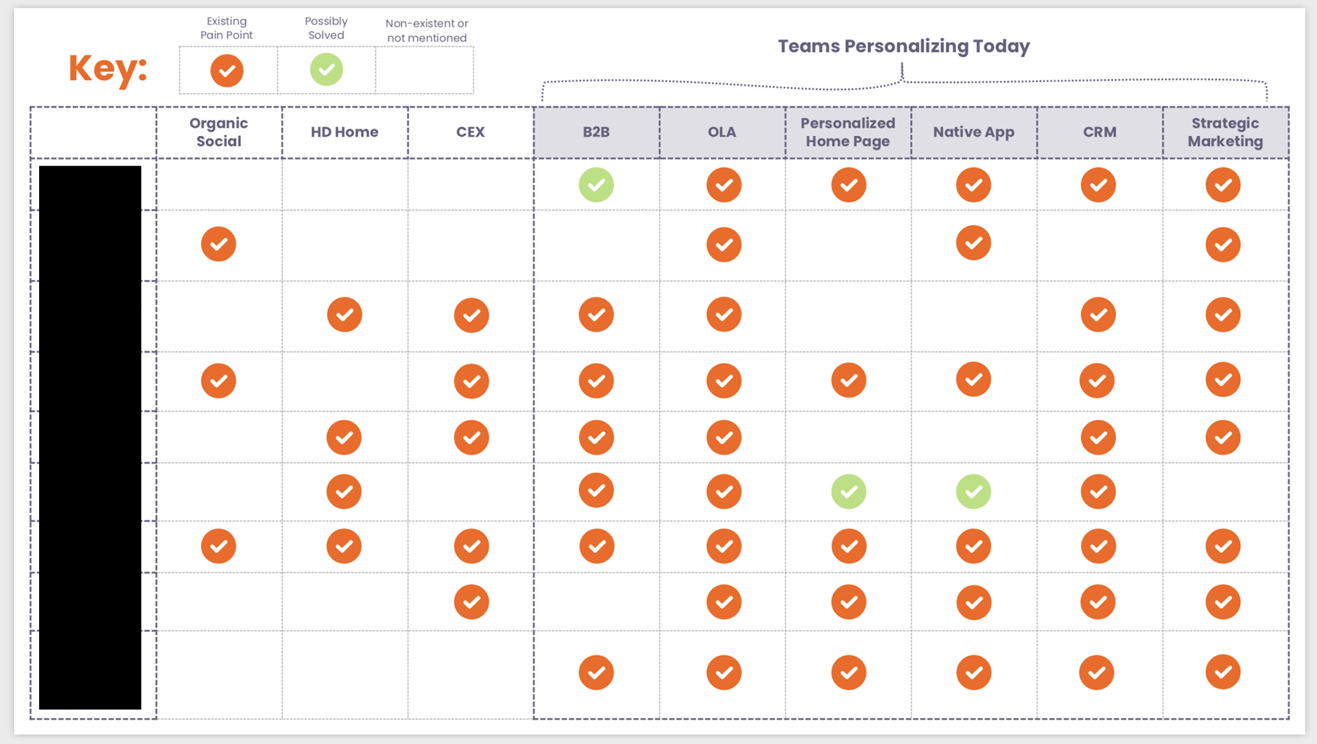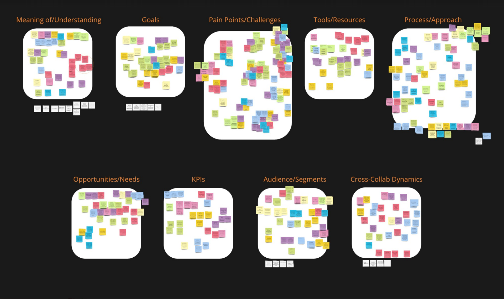 The first step was to understand the digital landscape of THD and any personalization efforts happening, but also what other companies are doing in the industry. I conducted several interviews, focus groups, and secondary research to gather information about approaches, pains, blockers, and more when it came to personalizing content. Below are some screenshots and artifacts of the research data.