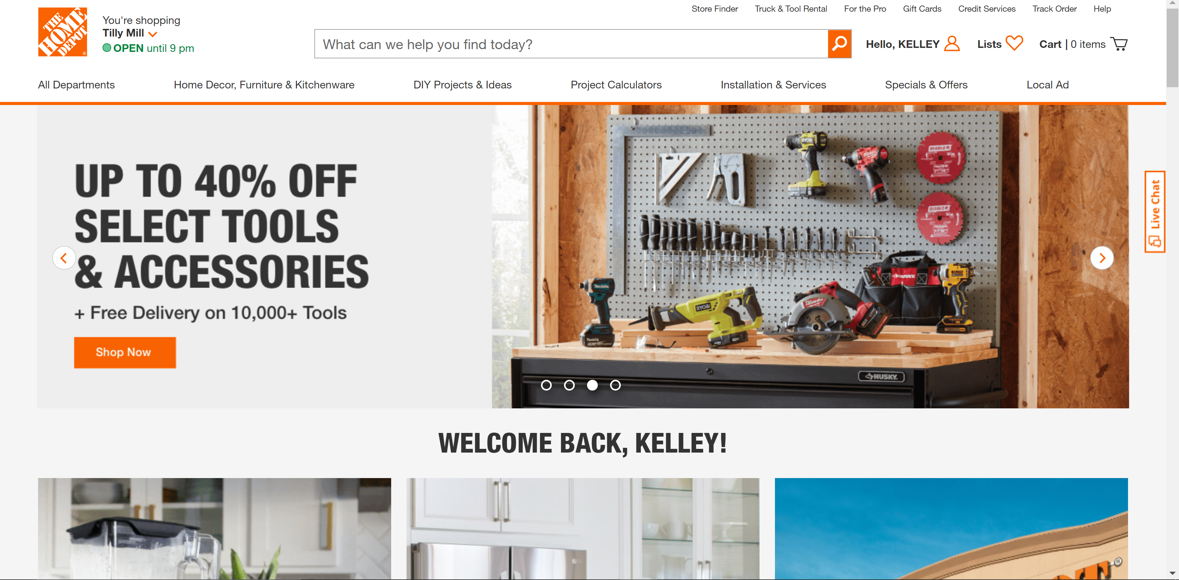 The Home Depot home page as an authenticated user, that contains displayed content published using our applications.